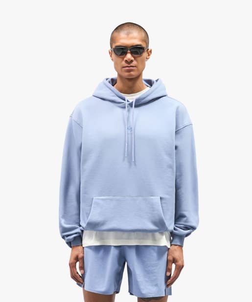 The hoodie follows the 247 oversized fit. It is roomy and relaxed, ideal for layering. For a closer fit, consider sizing down. The model is 187cm tall and 76kg, wearing a size Medium.