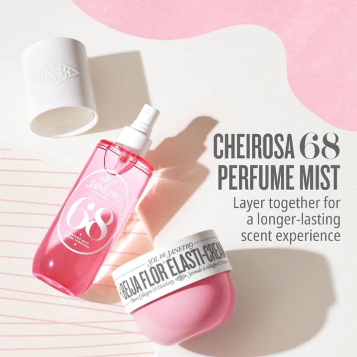 Next, enhance your scent with the fruity-floral Cheirosa 68 Perfume Mist. With top notes of pink dragonfruit and lychee, followed by Brazilian jasmine and hibiscus, it dries down to sheer vanilla and sun musk. It’s designed to layer beautifully with the cream and last longer on your skin.