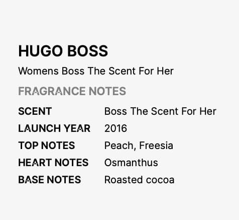 Boss The Scent For Her reflects Hugo Boss’s dedication to modern design, elegance, and refined sensuality.