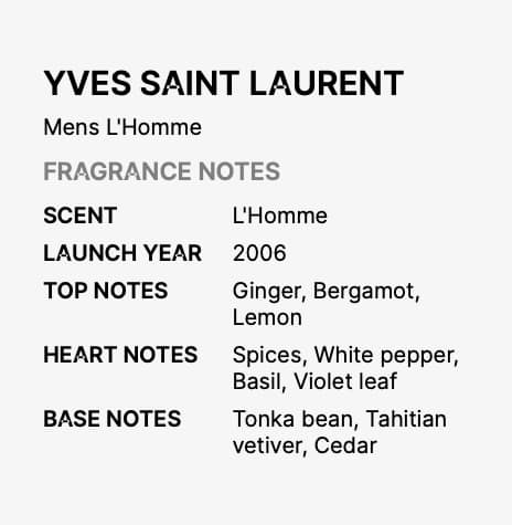The scent finishes with a refined and long-lasting base of tonka bean, Tahitian vetiver, and cedar. These woody and musky notes create depth and leave a smooth, unforgettable trail. The base ensures that L’Homme endures throughout the day while retaining its elegance.