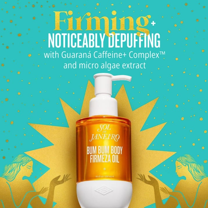 Next, apply the Bum Bum Firmeza Body Oil to damp skin. This fast-absorbing oil is powered by our exclusive Guaraná Caffeine+ Complex™ and a rich blend of natural oils like coconut, sunflower, and macadamia. These ingredients work together to visibly firm, depuff, and nourish, leaving your skin feeling supple and toned without any greasy residue.