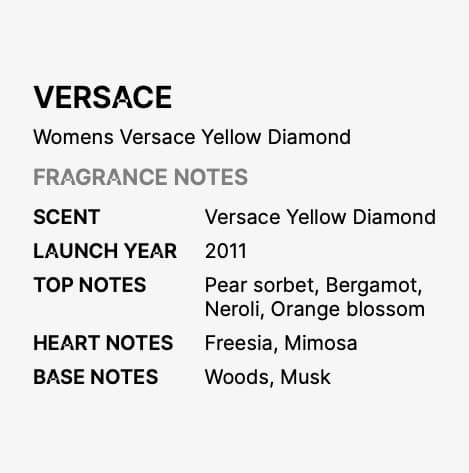 At the heart of Versace Yellow Diamond lies a delicate floral bouquet. The combination of freesia and mimosa brings a sense of charm, elegance, and timeless femininity. These middle notes add richness and softness, perfectly balancing freshness with floral sophistication.